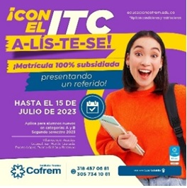 Hasta el 30 de junio de 2023 estará disponible la oferta del ITC que beneficia a los afiliados a Cofrem A y B Disponible estará hasta el 30 de junio de 2023 la promoción del Instituto Técnico Cofrem que beneficia a los afiliados a Cofrem con ingresos iguales o inferiores a cuatro salarios mínimos mensuales […]