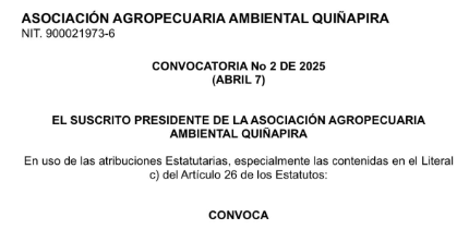 CONVOCATORIA # 02 – ABRIL 7 – 2025 Atención… LA ASOCIACIÓN AGROPECUARIA AMBIENTAL QUIÑARIPA CONVOCA A ASAMBLEA GENERAL EXTRAORDINARIA, ESTE VIERNES 11 DE ABRIL DE 2.025 El Canoero Informativo jhonpublicidad.com https://www.facebook.com/share/p/1SLUXGSxgR/?mibextid=wwXIfr